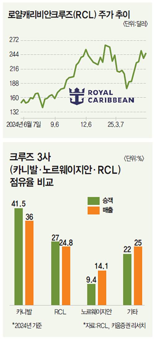 미국 증시에 상장한 크루즈 기업은 또 있다. RCL 외에도 카니발(CCL), 노르웨이지안크루즈라인(NCLH)이다. 지난해 매출액 기준 점유율만 놓고 보면 카니발(41.5%)이 1위다. RCL은 27%로 2위다. 그런데 시장에선 RCL을 가장 주목한다. RCL의 지난해 연간 주가 상승률은 92.9%. 반면 CCL과 NCLH는 각각 44.1%, 40.4%에 그쳤다.