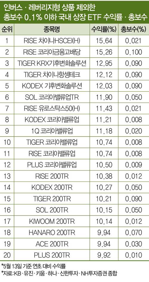 특히 낮은 수수료를 자랑하면서도 높은 수익률을 거둔 상품에 이목이 쏠린다. KB·유진·키움·하나·신한투자·NH투자증권에 따르면, 올해 중국과 기후변화 테마 상품 수익률이 좋았다. 연초부터 지난 5월 13일까지 인버스·레버리지형 상품을 제외한 총보수 0.1% 이하 국내 상장 ETF 수익률을 비교한 결과다.
