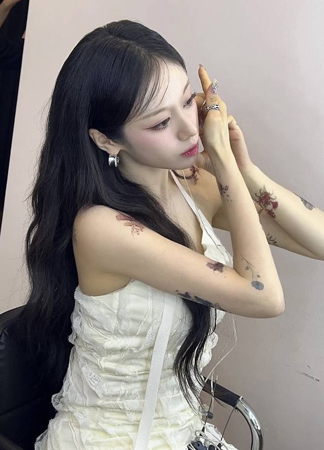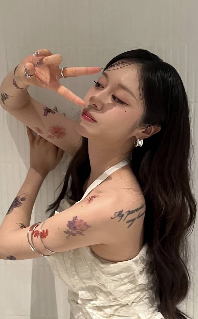 공개된 사진 속 지연은 화이트 원피스를 입고 손부터 등까지 이어지는 신체 곳곳에 꽃무늬의 타투를 그려넣은 모습을 뽐내고 있다.