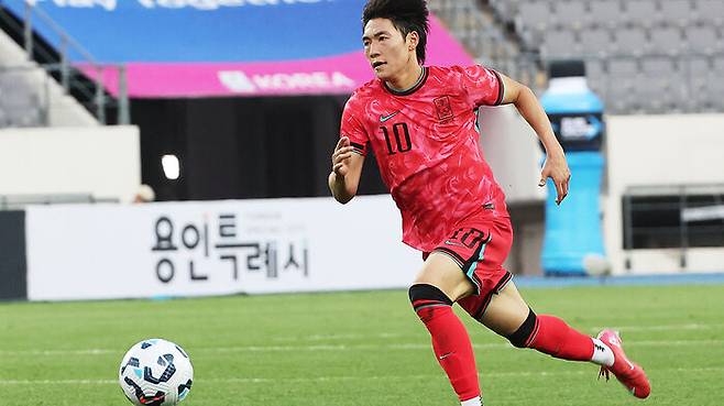 ▲ U-22 축구 국가 대표팀 친선전 호주와의 경기에서 한국 배준호가 드리블을 하고 있다.