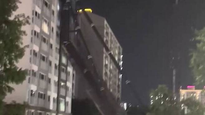 사고 중장비는 말뚝을 땅에 박는 44미터 높이 항타기인데, 넘어다가 인근 아파트 8층 부근부터 15층까지의 벽면에 기대게 된 것입니다.