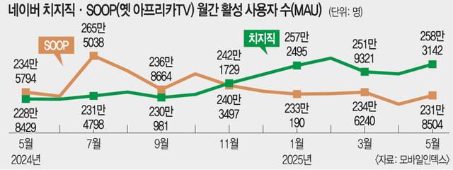 5일 데이터 플랫폼 기업 아이지에이웍스 모바일인덱스에 따르면 지난달 치지직의 MAU는 258만3142명으로 집계됐다. 지난해 5월 정식 출시된 치지직은 같은 해 11월부터 경쟁사 SOOP(옛 아프리카TV) MAU를 앞서며 국내 스트리밍 서비스 1위에 올랐다. SOOP의 지난달 MAU는 231만8504명으로, 치지직보다 26만명가량 적다.