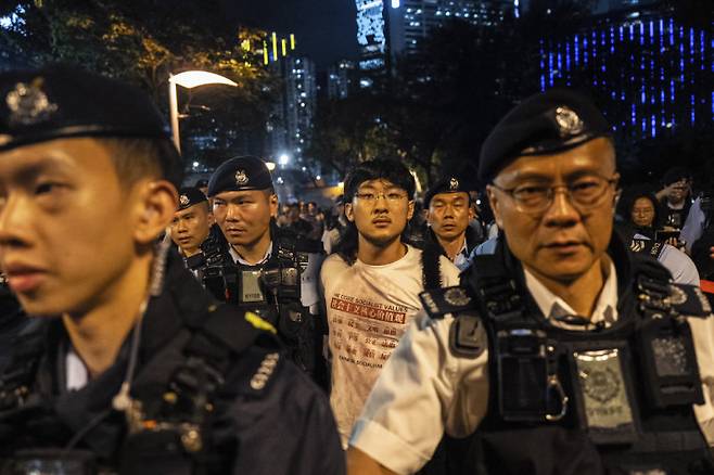 1989년 중국 톈안먼 민주화 시위 36주년을 맞아 4일 홍콩에서 열린 추모 집회에서 한 남성(중앙)이 경찰에 체포됐다. 홍콩에서는 과거 매년 6월 4일에 추모 집회가 열렸으나 2020년부터는 관련 집회를 여는 게 금지되었다. 중국 중앙정부의 홍콩에 대한 통제권 강화 과정에서 나온 조치로 풀이된다.