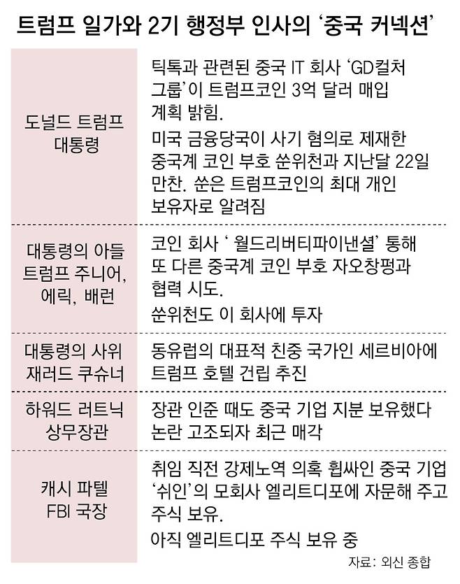 中기업-인사, 트럼프코인 대거 매입… 트럼프 세 아들 회사도 中과 밀착
