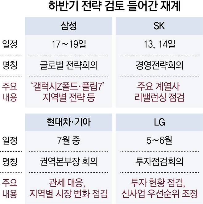 이재명 정부가 경제 살리기를 강조하며 ‘비상경제대응 태스크포스(TF)’를 가동한 가운데 주요 그룹들이 다음 주부터 하반기(7∼12월) 경영 전략회의를 시작한다. 국내외 경기가 좀처럼 살아나지 않는 상황에서 사업 리밸런싱(구조조정)과 관세 리스크 대응 등을 위해 고삐를 죌 예정이다. 주요 기업들은 새 정부 출범에 따라 향후 5년간의 투자 계획 검토에도 나설 전망이다.