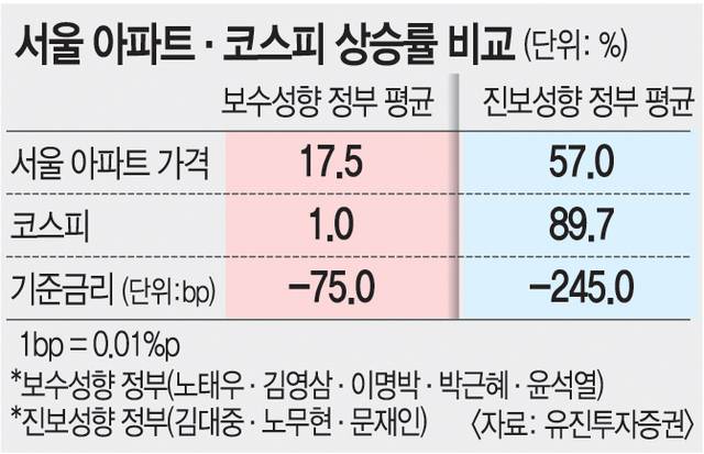 시장에서는 새 정부의 증시 부양책이 차질 없이 추진된다면 부동산 수익률을 넘어설 수 있다는 관측도 나온다. 유진투자증권에 따르면 진보성향 정부(김대중·노무현·문재인) 때 서울 아파트 가격은 평균 57.0% 올랐다. 같은 기간 코스피는 89.7% 상승했다. 문재인정부를 제외하고, 주가 상승률이 집값 상승률을 웃돌았다. 유진증권은 “과거 진보정권의 부동산 정책 실패를 반면교사 삼아 부동산보다 증시 정책이 강화될 전망”이라고 분석했다.