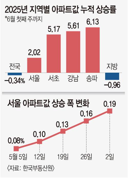 한국부동산원은 6월 첫째 주(2일 기준) 주간아파트가격동향에서 서울 아파트 매매가격이 전주 대비 0.19% 상승했다고 5일 발표했다. 경기·인천을 포함한 수도권이 상승 폭을 확대(0.03→0.05%)하고, 지방은 하락 폭을 축소(-0.05→-0.04%)하며 전국은 보합 전환(-0.02→0.00%)했다.