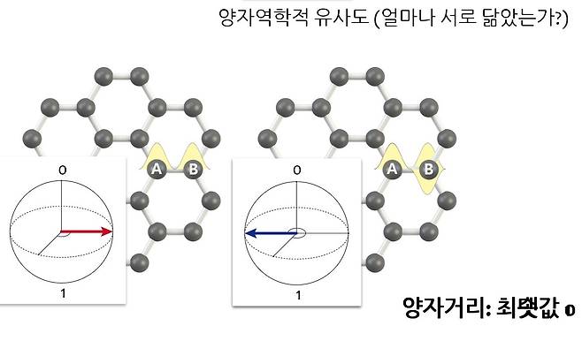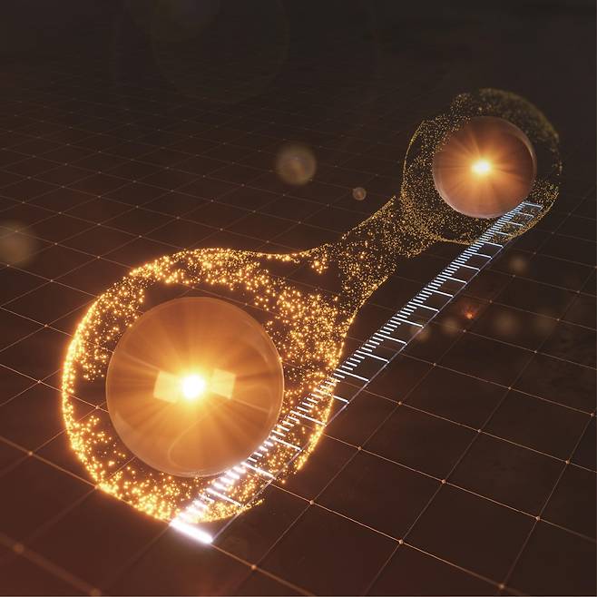 | ▲ 양자거리 측정 개념도 두 개의 노란 공은 전자를 나타내며, 그 아래 흰색 눈금은 거리를 측정한다는 의미로 ‘자’를 표현한 것이다. 전자 간의 유사성을 의미하는 양자 거리는 실제 거리와 약간 다른 개념이지만 ‘양자거리 측정’을 직관적으로 표현하기 위한 그림이다. // 그림설명 및 그림제공 : 연세대학교 김근수 교수 |