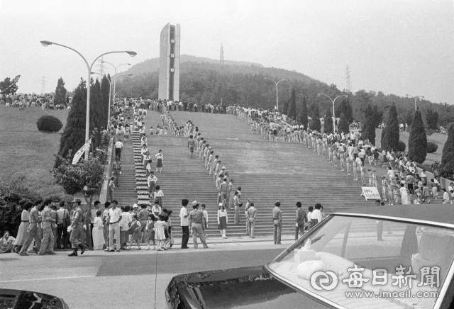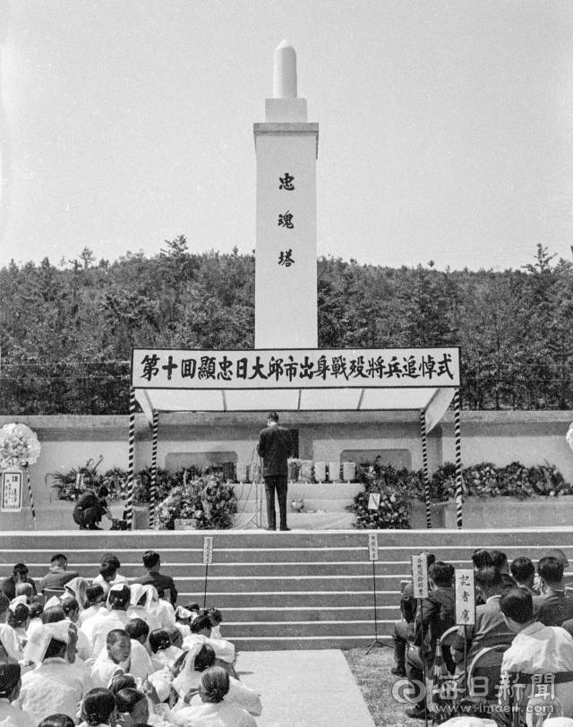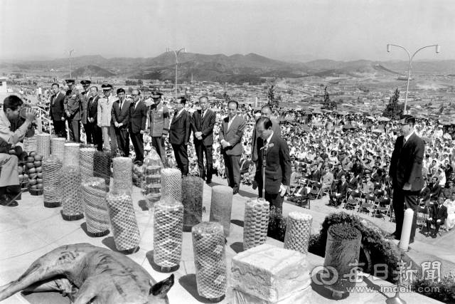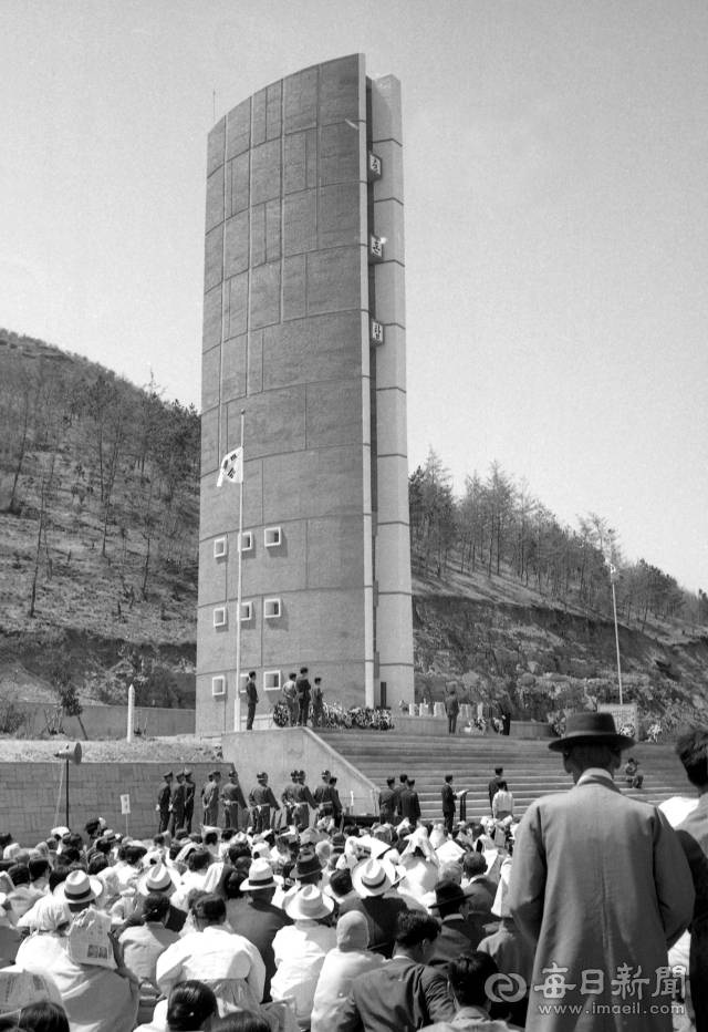 1971년 4월 20일, 마침내 대덕산(앞산) 기슭 9만9천173㎡(3만평) 부지에 높이 30미터, 둘레 9미터의 웅장한 새 충혼탑이 완공됐습니다. 이날 제막식에는 수성못 충혼탑에 자리했던 전몰 군경 용사 위패 이전 봉안식도 함께 열렸습니다. 4개월로 예정된 공사는 공기를 훌쩍 넘겨 1년 1개월 만에 끝이 났습니다. 나라 살림살이가 여의치 않다 보니 돈(세금)이 모자라 이 무렵 국가 공사는 늑장 준공이 다반사였습니다.