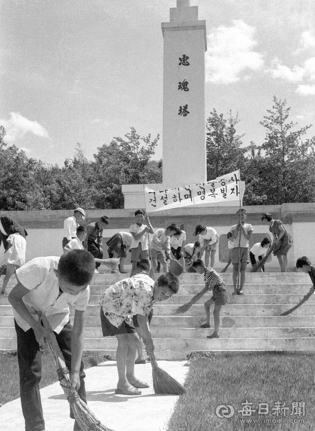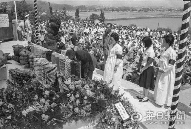 새로 단장한 앞산 충혼탑에서 맞은 첫 현충일에는 김덕엽 지사, 김수학 대구시장 등 각급 기관장과 유족, 시민 등 수천 명이 모였습니다. 앞산 충혼탑 앞으로 펼쳐진 두류산 자락은 곳곳이 헐벗었고, 그 아래로 듬성듬성 자리한 단층 가옥은 볼품 없지만 충혼탑 앞 제단에는 돼지 온마리에 갖은 제물이 가득했습니다.