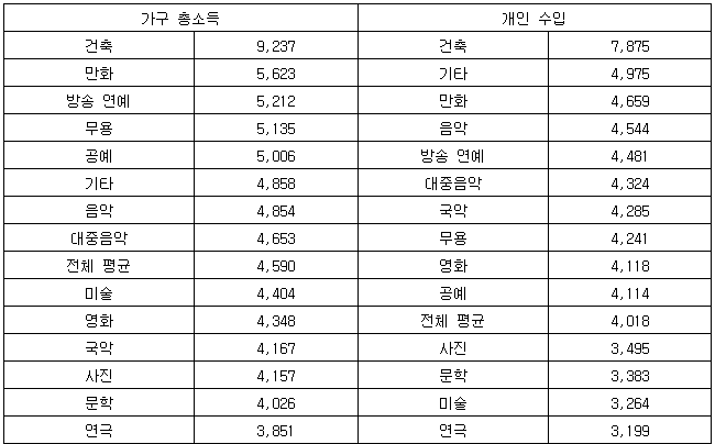 [표] 예술인 가구 총소득과 개인 수입 현황