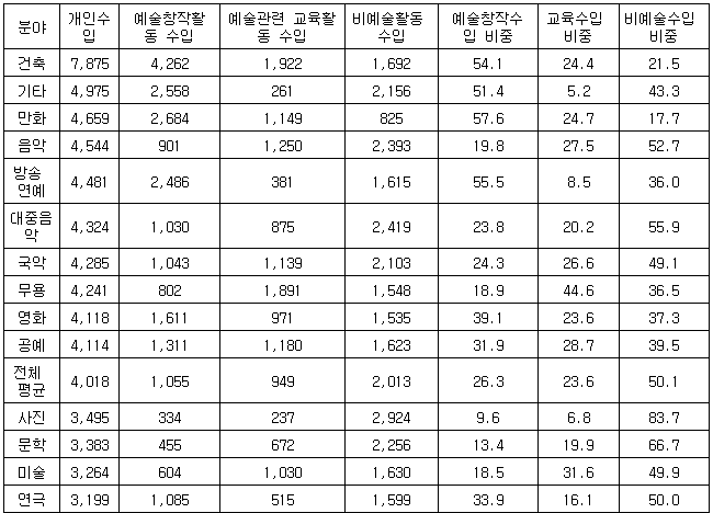 예술창작 활동 수입은 예술인이 자신의 본업으로 벌어들인 소득을 의미한다. 그 비중이 50%를 넘는 분야가 만화, 방송 연예, 건축, 기타 등 4개 분야에 불과했고, 대부분 그 비중이 20∼30%에 불과했다.