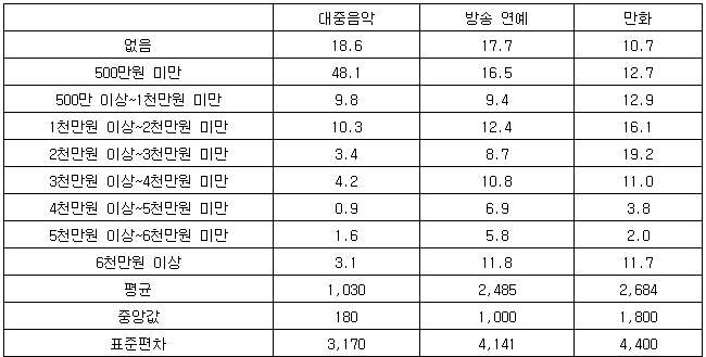 [표] 대중음악, 방송 연예, 만화 분야 예술창작 활동 수입 현황