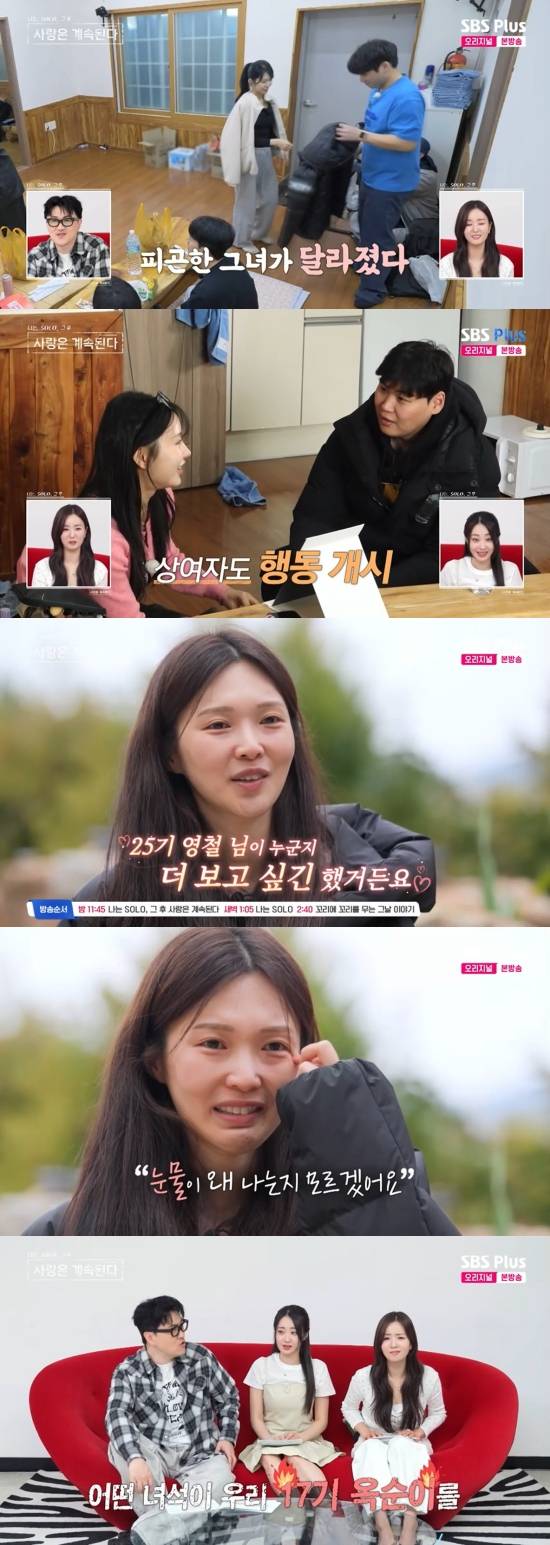 한편 17기 옥순은 제작진과 인터뷰를 하던 중 갑작스럽게 눈물을 흘렸다. 그는 "25기 영철님이 누군지 더 보고 싶긴 했다. 그런데 도망을 다니는 느낌"이라며 "눈물이 왜 나는지 모르겠다고"고 말했다.