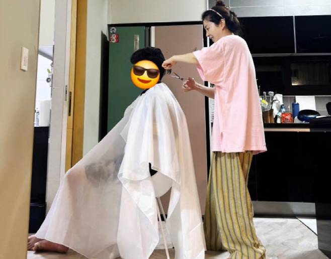 공개된 사진에는 송윤아가 집에서 직접 아들의 머리를 다듬어주는 모습이 담겼다.