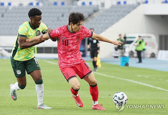 배준호는 5일 용인미르스타디움에서 열린 호주와의 '하나은행 초청 U-22 축구 국가대표팀 친선경기' 1차전에 선발 출전해 전반전을 소화했다. 팀은 득점 없이 0-0으로 비겼다.
