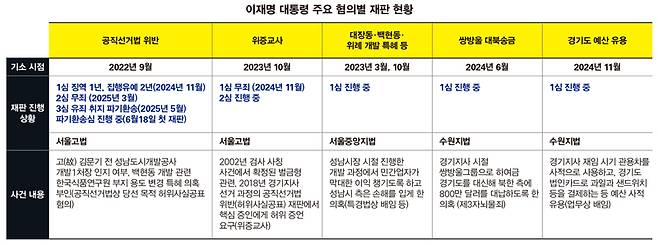 현재로서는 두 가지 가능성이 점쳐진다. 민주당의 속도전이 현실화하거나 사법부가 먼저 이 대통령의 재판을 중지하기로 결정할 가능성이다. 이렇게 된다면 이 대통령의 재판은 모두 임기 종료 후로 미뤄진다. 이 대통령은 올해 최종 결론이 나올 것으로 점쳐졌던 선거법 위반 사건 외에 △위증교사 △쌍방울그룹의 경기도 대북송금 사건 △경기도 예산 유용 △대장동·백현동·위례 개발 특혜 의혹과 성남FC 후원금 사건과 관련해 기소돼 재판 중이다(표 참조).