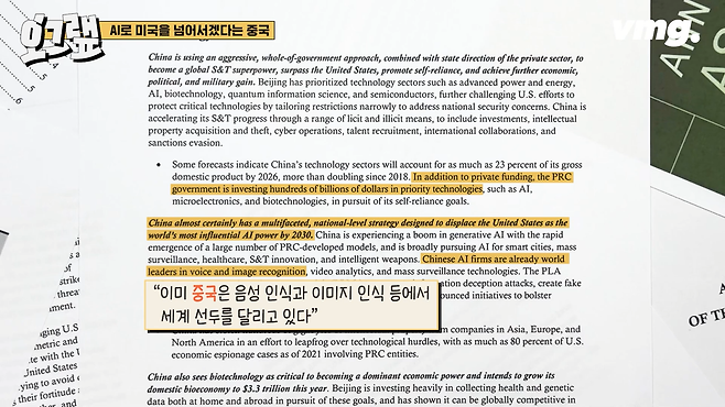 "중국이 미국을 능가하는 과학기술 강국이 되기 위해 수천억 달러를 투자하고 있다"는 내용부터, "2030년까지 미국을 제치고 세계에서 가장 영향력 있는 AI 강국이 되려 한다.", "이미 중국은 음성 인식과 이미지 인식 등에서 세계 선두를 달리고 있다"는 등 이미 중국이 미국에 실질적인 위협이 되고 있다고 말하고 있는 겁니다. 중국에 대한 미국의 평가가 단순히 정보기관의 과대평가라고 보기도 어려운 게 젠슨 황도 인터뷰에서 중국이 뒤에 있지 않다고 이야기를 했습니다.