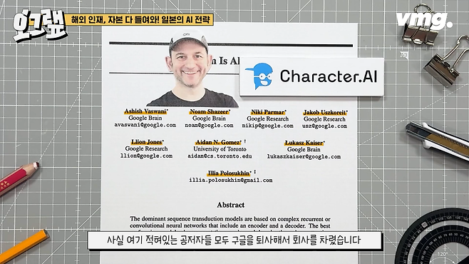 오그랲에서 자주 언급했던 구글의 논문 이야기를 다시 해보겠습니다. 딥러닝의 혁신을 불러온 트랜스포머 구조를 제시한 ‘Attention is All you need’ 입니다. 지난 ‘AI 상담’ 편에서 이 논문의 공저자 중 한 명인 노암 샤지어가 설립한 캐릭터닷AI 이야기를 한 적이 있죠. 사실 여기 적혀있는 공저자들 모두 구글을 퇴사해서 회사를 차렸습니다.