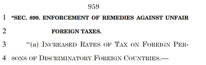 제899조는 미국 기업에 "불공정(unfair)"한 세금을 부과하는 국가의 개인, 법인, 정부기관, 국부펀드 등에 대해 보복성 원천징수 세금을 부과할 있도록 하는 근거를 마련하기 위한 조항입니다. 미국 재무부 장관은 불공정한 세금을 운영하는 국가를 "차별적 해외 국가(discriminatory foreign country)"로 규정하고 원천징수세율 인상 조치를 할 수 있습니다.