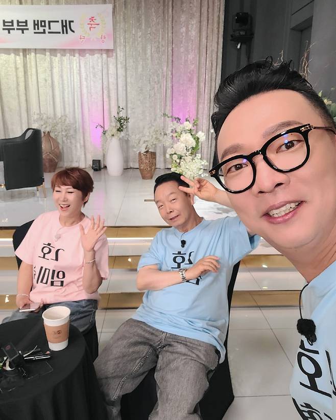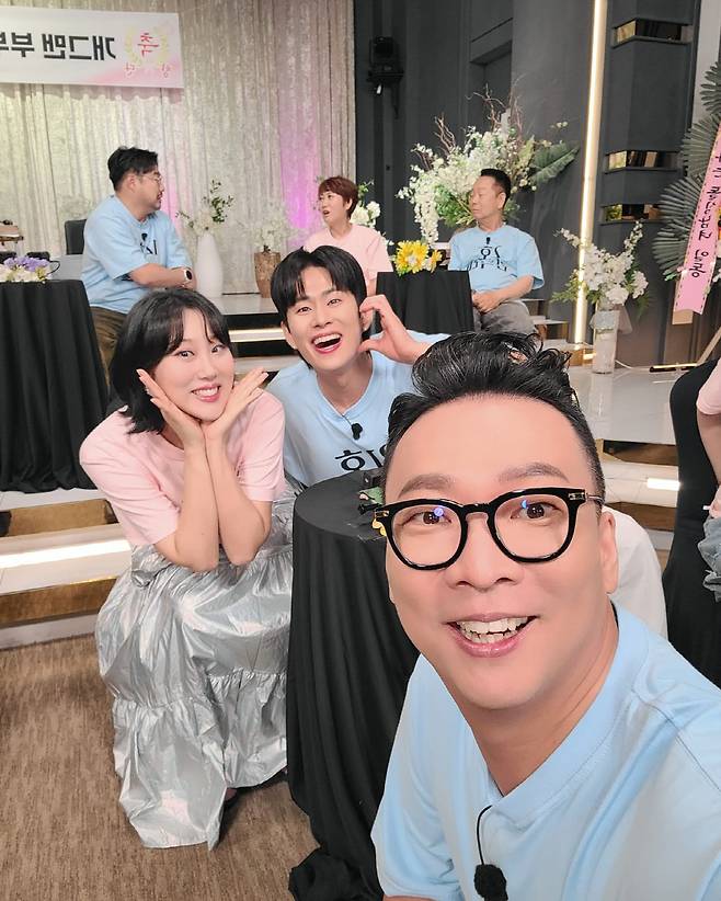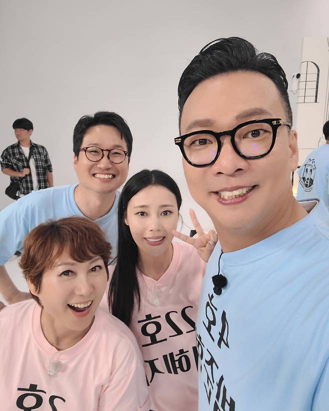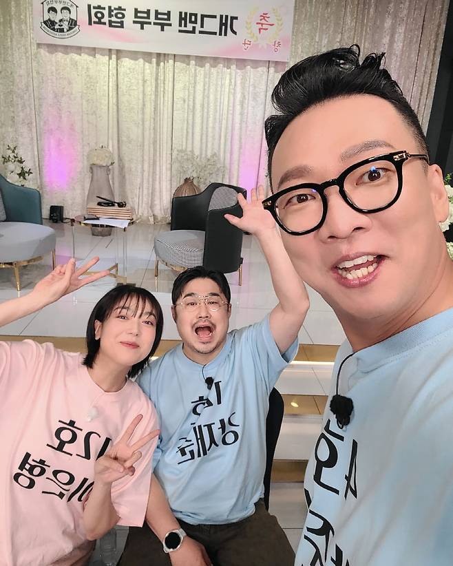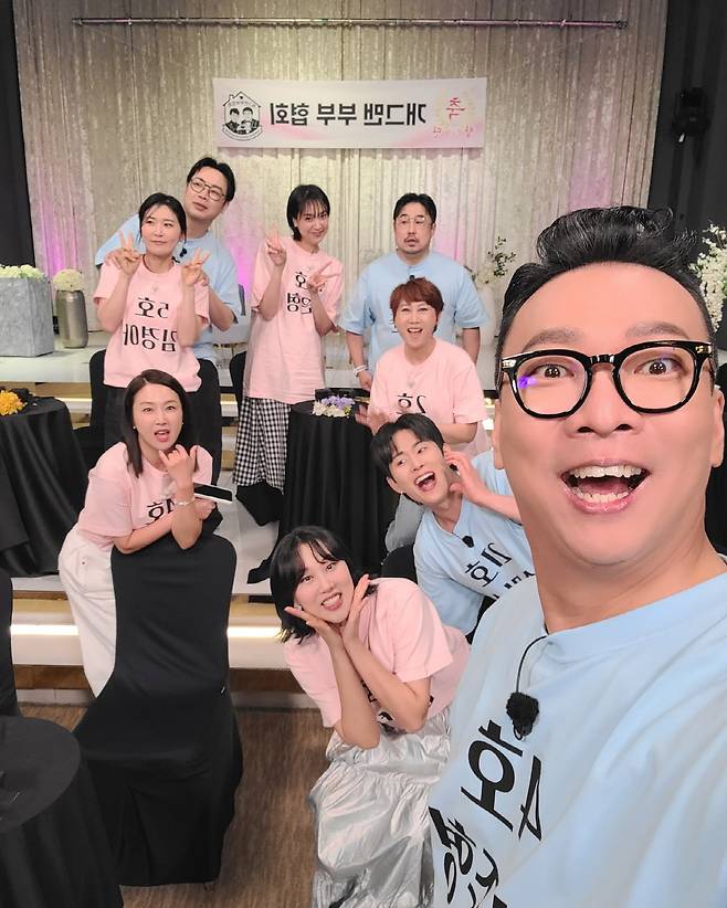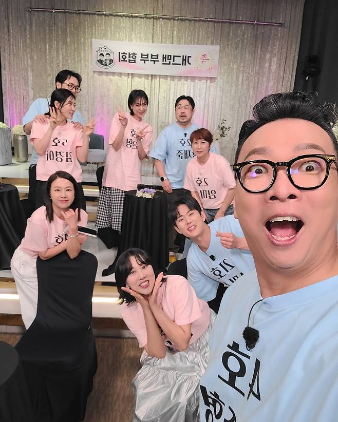 사진 속에는 분홍색과 하늘색 티셔츠를 맞춰 입은 개그맨부부들이 서로 포즈를 취하며 장난기 어린 표정으로 화기애애한 분위기를 연출했다.