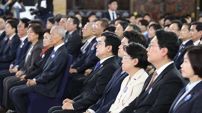 ▲ 4일 서울 여의도 국회에서 열린 제21대 대통령 취임선서식에 참석한 여야 지도부가 이재명 대통령의 '국민께 드리는 말씀' 연설을 경청하고 있다.