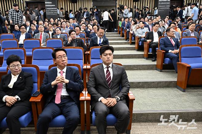 ◆ 박정훈> 그렇죠. 그런데 이게 중요한 문제인 게 뭐냐면 김용태 비대위원장을 찾아가서 동반 사퇴하자, 이렇게 압박을 했다는 보도가 나왔잖아요. 그 보도를 어제 의총 중에 한 의원이 물었습니다. 김용태 비대위원장이 앞에 있으니까. 이런 보도가 나왔는데 이거 사실이에요? 이렇게 물었어요. 그랬더니 김용태 위원장이 뭐라고 했냐면 확인해 줄 수 없습니다, 이렇게 얘기했어요. 아니, 이런 건 확인해 주셔야죠. 이렇게 물어봤는데도 그래도 확인해 줄 수 없습니다. 이렇게 얘기했어요. 아닙니다라고 얘기 안 했습니다. 원내대표실에서는 그 보도가 사실 무근이라고 보도자료를 냈는데.