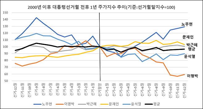 2000년부터 현재까지 우리나라에서 대통령 선거는 여섯 차례 있었는데, 대통령선거 전후 의 주가흐름을 살펴보면, 평균적으로 대통령선거가 있었던 해당 월말 주가지수를 기준으로 이후 1년 동안 약 4% 하락한 것으로 나타나고 있습니다.