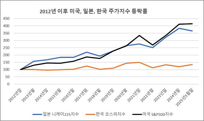2012년말부터 현재까지 약12년동안 미국과 일본 주식시장은 연평균 20% 이상의 지속적인 상승률을 나타낸 반면, 한국주식시장은 제자리에 머물러서 횡보하는 모습을 나타냈습니다
