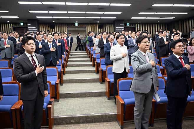◆ 김종인> 그러니까 당분간은 예를 들어서 나는 김용태 비대위원장이 어저께 자기는 사퇴를 거부를 하고 지금 비대위를 다시 김용태 위원장이 위원장으로서 비대위를 다시 구성할 수밖에 없어요. 그렇게 해서 당을 어느 정도 좀 새로운 모습으로 변화를 시킨 다음에 무슨 전당대회를 하든지 뭐든지 하지 않고서는 내가 보기에는 별로 새로운 희망을 가질 수가 없다고 봐요.