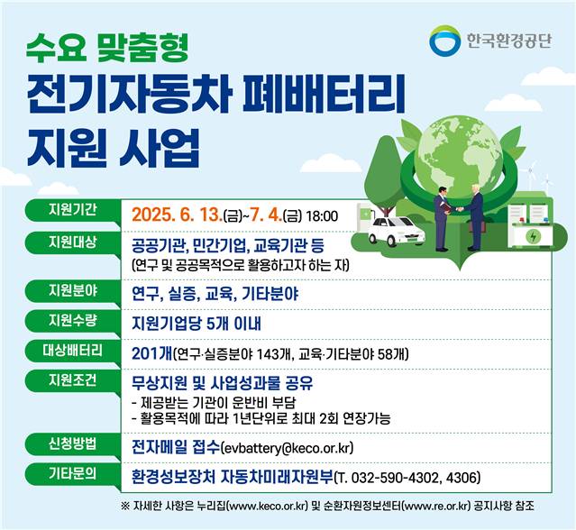 환경부 산하 한국환경공단은 13일부터 '2025년 수요 맞춤형 전기자동차 폐배터리 지원사업' 신청서를 접수한다고 밝혔다.