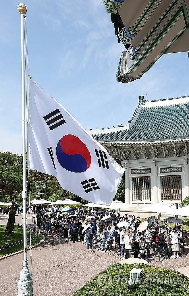 (서울=연합뉴스) 김성민 기자 = 현충일인 6일 시민들의 관람이 진행되고 있는 서울 종로구 청와대에 조기가 게양돼 있다. 2025.6.6