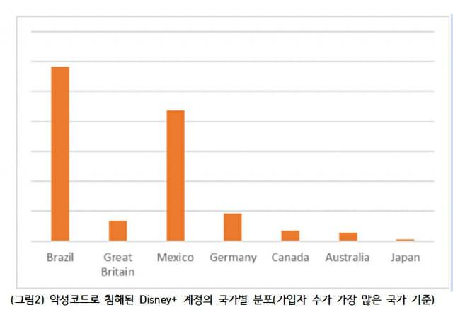 카스퍼스키 전문가들은 유출된 데이터셋에서 68만850건의 디즈니플러스 계정을 탐지했다. 역시 브라질이 가장 많은 침해 계정을 보였으며, 멕시코와 독일이 그 뒤를 이었다.