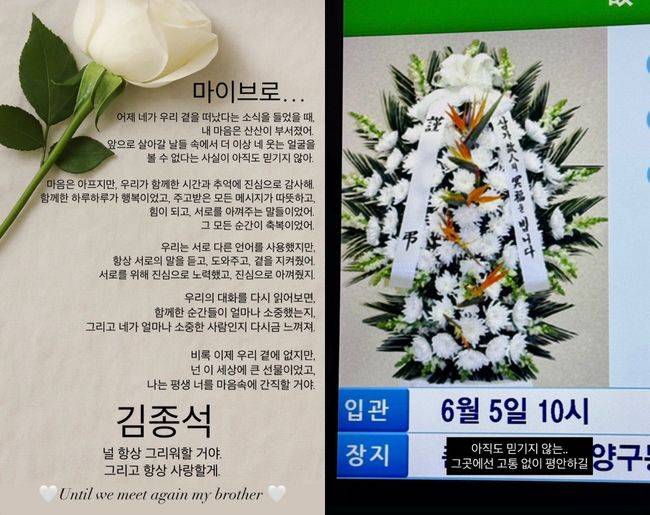 김종석의 지인 A씨는 5일 자신의 계정에 "마이 브로.. 어제 네가 우리 곁을 떠났다는 소식을 들었을 때, 내 마음은 산산이 무서졌어. 앞으로 살아갈 날들 속에서 더이상 네 웃는 얼굴을 볼 수 없다는 사실이 아직도 믿기지 않아"라고 글을 올렸다.
