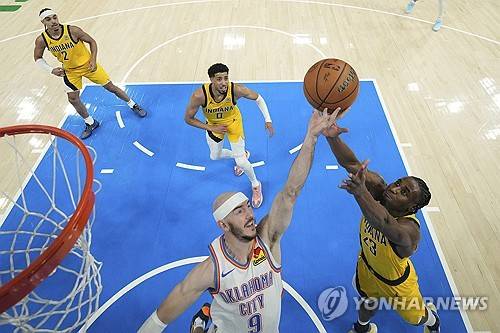 Oklahoma City Thunder guard Alex Caruso (9) reaches for the ball against Indiana Pacers forward Aaron Nesmith (23) during the first half in Game 1 of the NBA Finals basketball series Thursday, June 5, 2025, in Oklahoma City. (Kyle Terada/Pool Photo via AP)