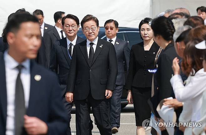 (서울=연합뉴스) 홍해인 기자 = 이재명 대통령과 김혜경 여사가 6일 서울 동작구 국립서울현충원에서 열린 70회 현충일 추념식에 입장하고 있다. 권혁기 의전비서관 내정자(왼쪽), 박관천 대통령경호처 차장 내정자(대통령 오른쪽 뒤)가 이 대통령 부부를 수행하고 있다. 2025.6.6 [대통령실통신사진기자단]