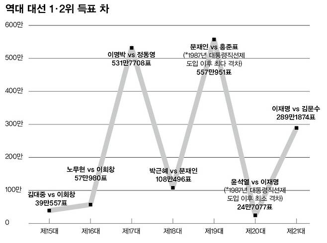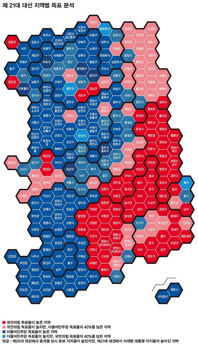 이 대통령이 대구(23.2%)·경북(25.5%)에서 패하긴 했지만 유의미하게 높은 득표를 기록했다는 분석도 나온다. 문재인 전 대통령이 대구·경북에서 20%를 넘는 득표를 보인 뒤 계속해서 민주당 지지가 높아지는 흐름을 보이기 때문이다. 민주화 이후 한국 선거에서 중요한 변수로 작용했던 지역주의는 2000년대 이후 영향력이 작아지는 추세다. 추가 분석이 필요하지만 대구·경북에서 세대에 따라 지역주의 투표 성향 차이가 커져 시간이 지나면서 보수 지지층이 약해질 가능성도 제기된다.