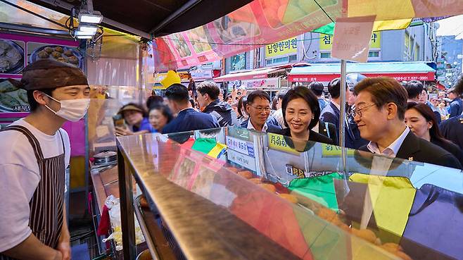 ▲ 이재명 대통령과 김혜경 여사가 6일 서울 동작구 남성시장을 방문해 상인과 인사하고 있다.