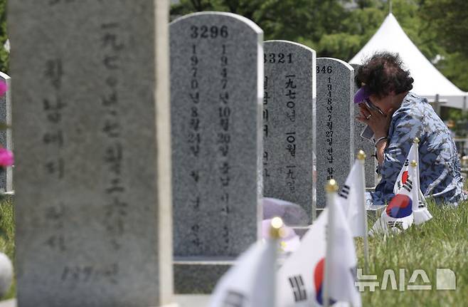 [서울=뉴시스] 김명년 기자 = 현충일인 6일 오전 서울 동작구 국립서울현충원에서 참배객이 눈물을 닦고 있다. 2025.06.06. kmn@newsis.com