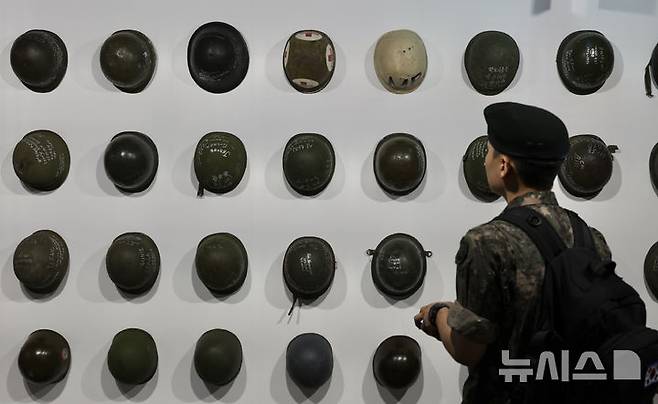 [서울=뉴시스] 김명년 기자 = 현충일인 6일 오전 서울 강남구 SJ쿤스트할레에서 열린 프로젝트 솔져 한국전쟁 75주념 기념 특별전 'FREEDOM IS NOT FREE'에서 한 국군 장병이 전시회를 관람하고 있다. 2025.06.06. kmn@newsis.com