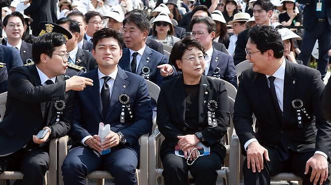 ▲ 더불어민주당 박찬대 당 대표 권한대행 겸 원내대표(왼쪽부터), 국민의힘 김용태 비상대책위원장, 조국혁신당 김선민 당 대표 권한대행, 개혁신당 천하람 원내대표 겸 당 대표 권한대행이 6일 서울 동작구 국립서울현충원에서 열린 70회 현충일 추념식에 참석해 행사 시작 전 대화하고 있다.