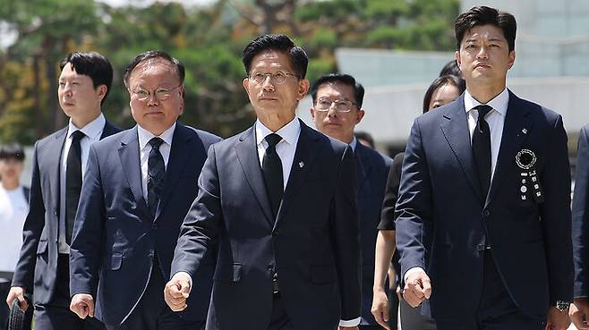 ▲ 국민의힘 김문수 전 대선후보가 6일 서울 동작구 국립서울현충원을 찾아 참배한 뒤 김용태 비상대책위원장과 함께 이동하고 있다.