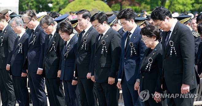 (서울=연합뉴스) 홍해인 기자 = 6일 서울 동작구 국립서울현충원에서 열린 70회 현충일 추념식에서 5부 요인과 장관, 여야 정치인들이 묵념하고 있다.