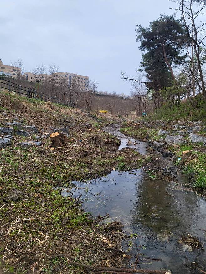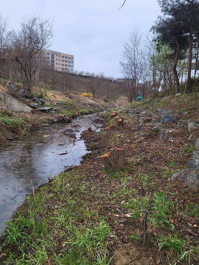 | ▲ 하천에 벌목된 버드나무 밑둥이 그대로 남아 있다 |