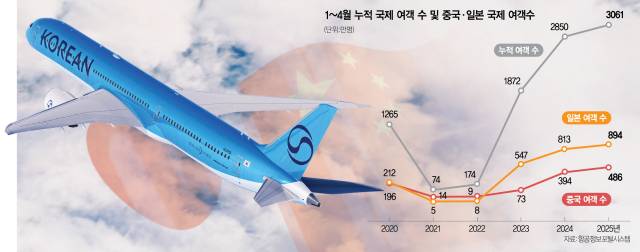 엔저가 꺾였지만 일본 여객 수요도 여전히 탄탄하다. 지난해의 상승 추세가 지속되며 올 들어 4월까지 일본 누적 여객 수는 893만 9363명으로 역대 최고치를 기록했다. 올해 들어 원·엔 환율이 꾸준히 오르며 한때 100엔당 1000원을 돌파했지만 아랑곳하지 않고 일본을 찾는 발길은 끊이지 않고 있다. 최근 저비용항공사(LCC)들이 대도시뿐 아니라 구마모토·요나고·기타큐슈 등 소도시 취항을 늘린 것도 일본 여객 증가의 배경으로 꼽힌다.
