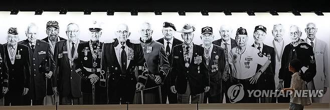 (서울=연합뉴스) 김도훈 기자 = 현충일인 6일 서울 강남구 논현동 SJ 쿤스트할레에서 한국전쟁 발발 75주년을 맞아 열린 'Freedom Is Not Free: 프로젝트 솔져 - 한국전쟁 참전용사를 찾아서' 특별 전시회를 찾은 어린이가 대형 사진 앞을 지나고 있다.