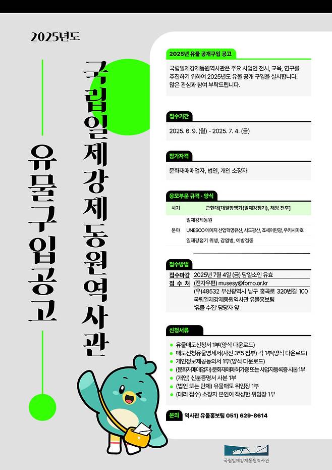 유물 공개 구입 대상은 우리나라 근현대(대일항쟁기, 일제강점기) 당시 일제강제동원 관련 유물, 유네스코 메이지 산업혁명유산, 위생·감염병·예방접종 등 관련 자료다. 일제강제동원 유물 관련해서는 러시아 사할린·동남아시아·중서부태평양 지역 강제동원 자료, 일본군 ‘위안부’, 조선여자근로정신대, 당시 신문 등에 게재된 직업소개광고, 포로수용소·포로감시원·조선인 전범재판 등 관련 자료, 조선인 원폭피해 자료, 징용·징용 거부·항일운동 관련 자료 등이다. 또 유네스코 메이지 산업혁명 관련해서는 사도광산, 하시마탄광, 다카시마탄광, 미이케탄광, 야외타제철소, 나가사키조선소, 우류댐 등 자료를 비롯해 우키시마호 폭침 관련 자료도 수집 대상이다.