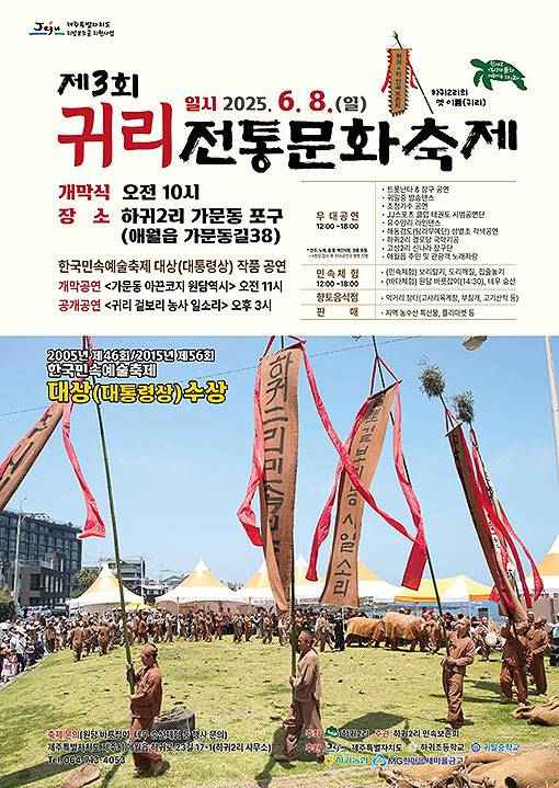 올해로 3회째를 맞는 '귀리전통문화축제'는 제주의 전통문화와 민속예술의 우수성을 알리고 하귀2리의 천년 공동체 정신을 기리기 위해 해마다 개최되고 있다.