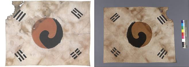 | ▲ 2009년 5월 26일 서울시 은평구 진관사의 부속건물인 칠성각(七星閣)을 해체ㆍ복원하는 과정에서 발견된 진관사 태극기의 앞과 뒷면 |