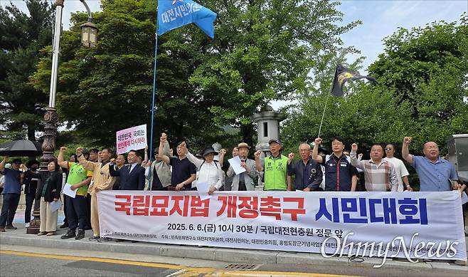 민족문제연구소대전지역위원회, 평화재향군인회, 홍범도장군기념사업회대전지역모임, 세상을 바꾸는 대전민중의힘 등 대전지역 시민사회단체는 이날 대전현충원 입구에서 '친일반민족·반민주행위자, 군사반란 가담자 등 이장을 위한 국립묘지법 개정 촉구 시민대회'를 개최했다.